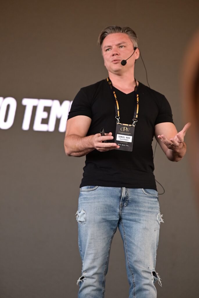 Samuel Rose, da NKG films e Doob Films trouxe uma perspectiva marcante e complementar ao painel do congresso. Hoje ele atua fortemente no mercado publicitário, mas revelou que tudo começou — e muito do que ele é como profissional se deve — à sua formação no universo dos vídeos e fotografias de casamento.